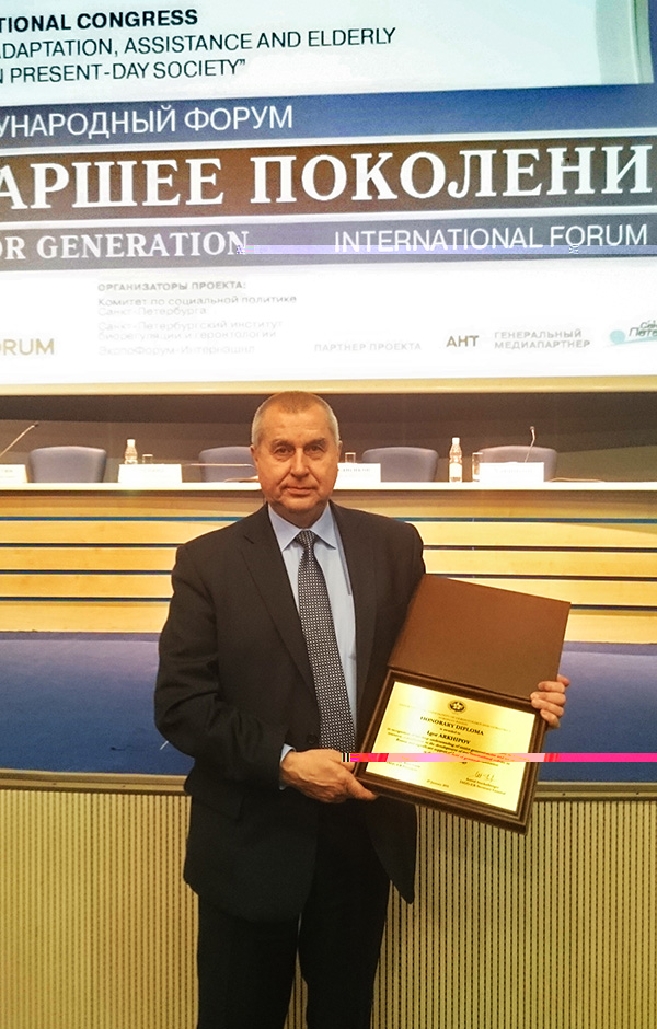 18-21 марта в Санкт-Петербурге состоялся X Международный форум "Старшее поколение". На Форуме директору ФГБУ "Всероссийский научно-методический геронтологический центр" И.В. Архипову был вручен диплом Европейского отделения Международной ассоциации геронтологии и гериатрии в знак признания его глубокого понимания старшего поколения в качестве ценного ресурса, вклад в развитие медицины и социальной помощи в России и значительную поддержку международного сотрудничества в области геронтологии.